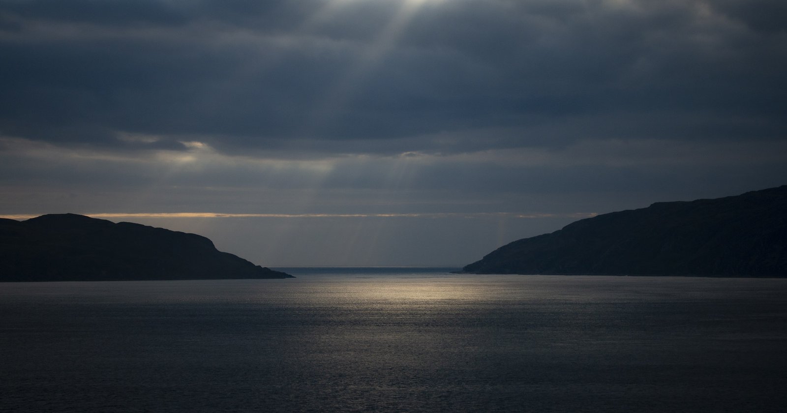 Sun’s rays bursting through storm clouds between the isles of Jura and Scarba.